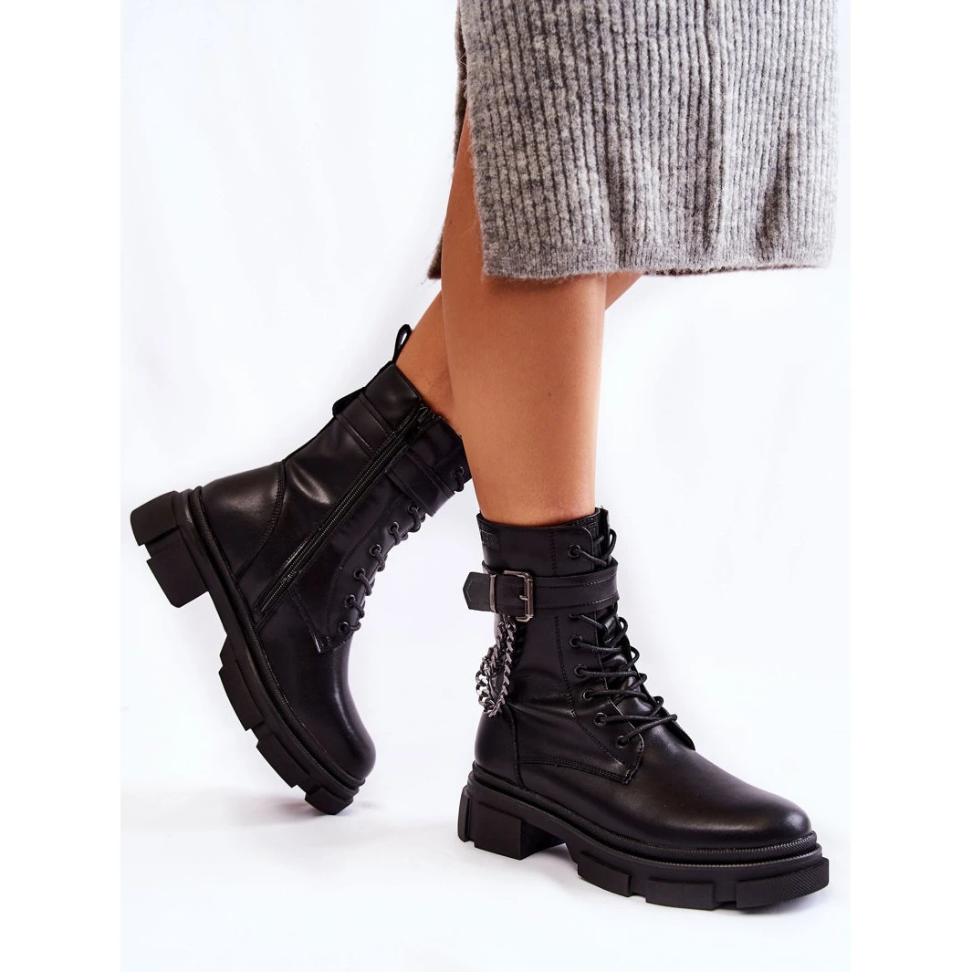 Bottes – les bottes de la marque Big Star sont en cuir naturel. Ils ont un laçage classique et une fermeture éclair sur le côté de la tige. La chaîne décorative n’est pas amovible, tandis que la ceinture à boucle est réglable. L’intérieur des bottes est isolé avec une couverture de chaussure douce au toucher. De plus, le contrefort de talon de ces chaussures est isolé. Les boots sont montées sur un talon plat et une plateforme. Lorsque vous choisissez une taille, veuillez utiliser le tableau des tailles.