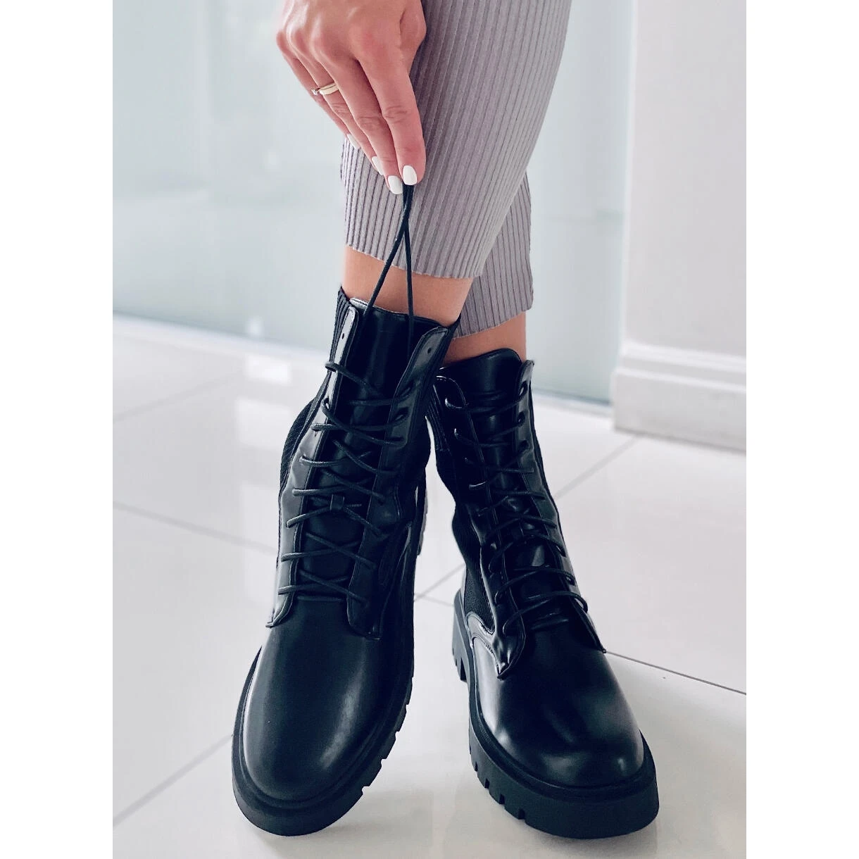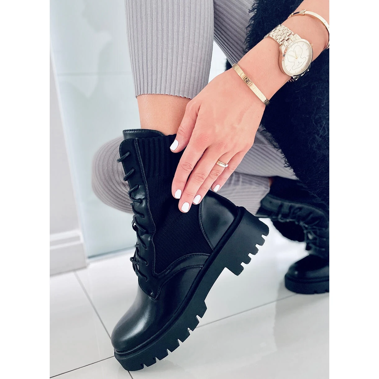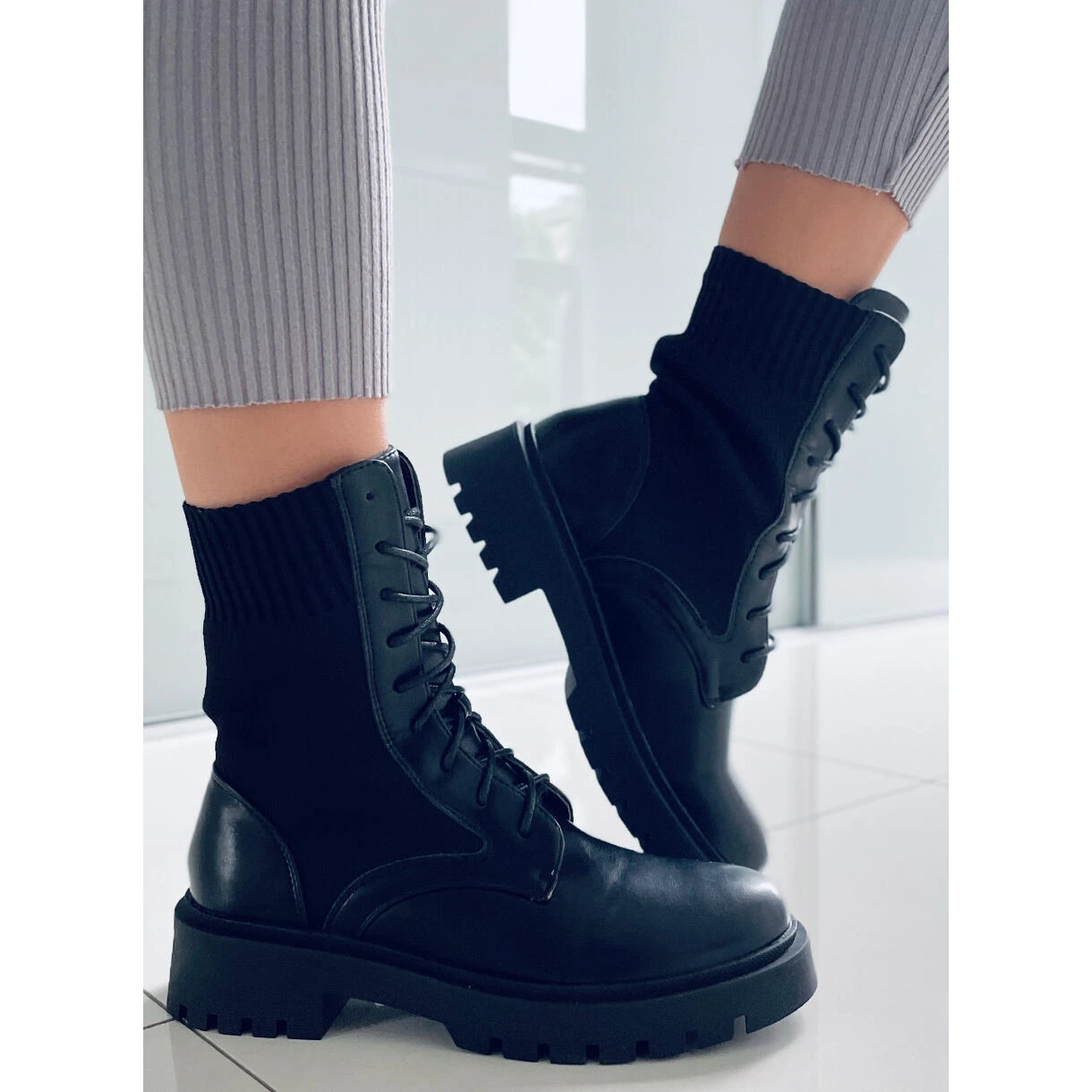 Bottes pour femmes – travailleuses à semelles hautes. Le modèle avec tige chaussette est déjà un classique de la mode 🙂 Grâce au laçage, il s’adapte à toutes les épaisseurs de pied, et la tige souple adhère parfaitement à la jambe et facilite l’enfilage… C’est une chaussure parfaite pour l’automne! Matériau extérieur – cuir écologique + tissu.