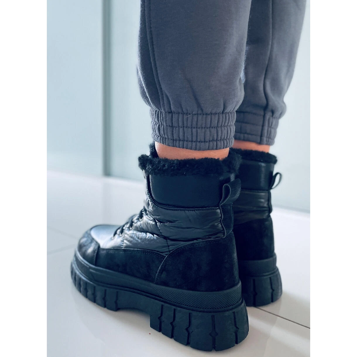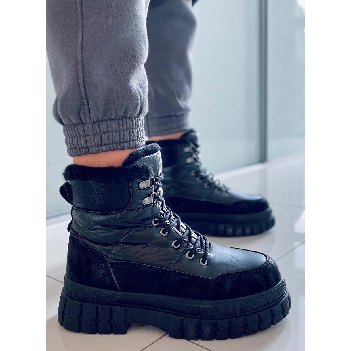 Bottes à lacets pour femmes – bottes de neige à semelles hautes. C’est un modèle unique au caractère sportif et à l’isolation épaisse, qui apportera chaleur et confort les jours les plus froids… Dans ces chaussures, l’hiver ne vous fera pas peur ! Matériau extérieur – daim écologique + tissu en nylon.