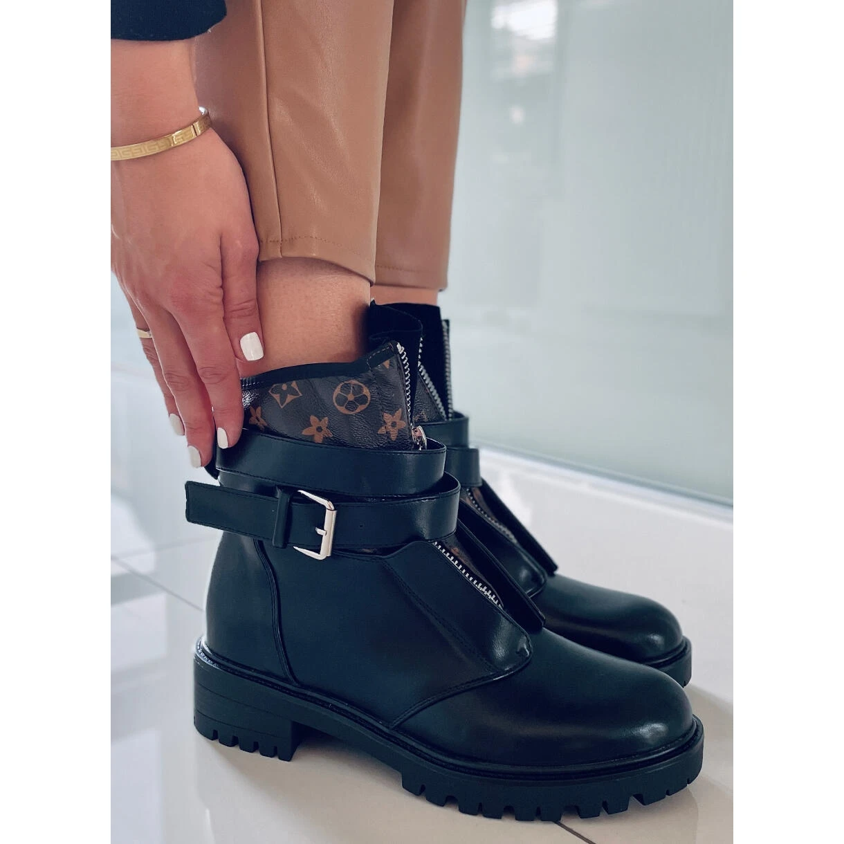 Bottines femme grain sur semelle avec protecteur. Si vous aimez les solutions mode, ces chaussures sont faites pour vous ! Un motif élégant et une fermeture éclair argentée sur le devant attirent l’attention, et les rayures autour de la cheville le soulignent magnifiquement … 🙂 Ils sont faits de cuir écologique et l’intérieur est doublé de fourrure délicate.