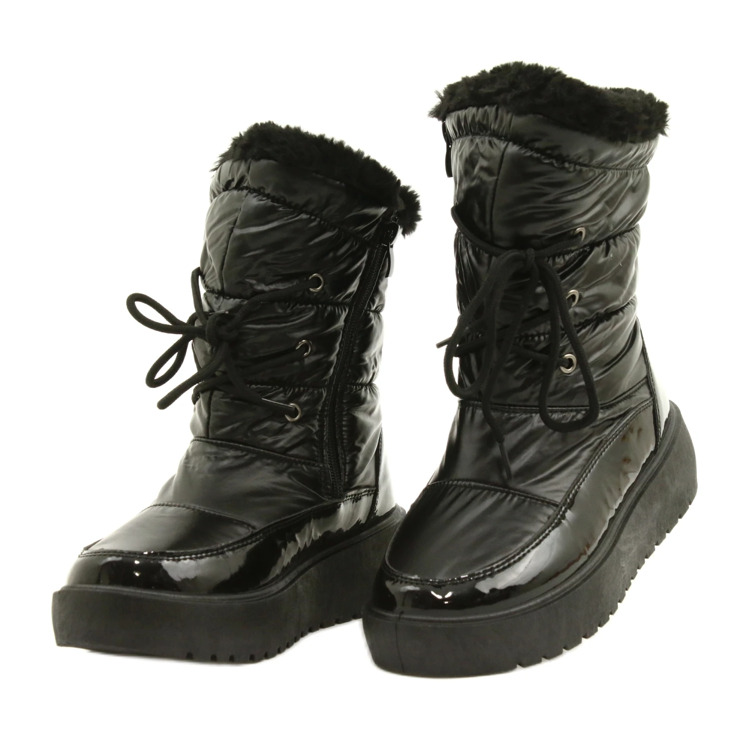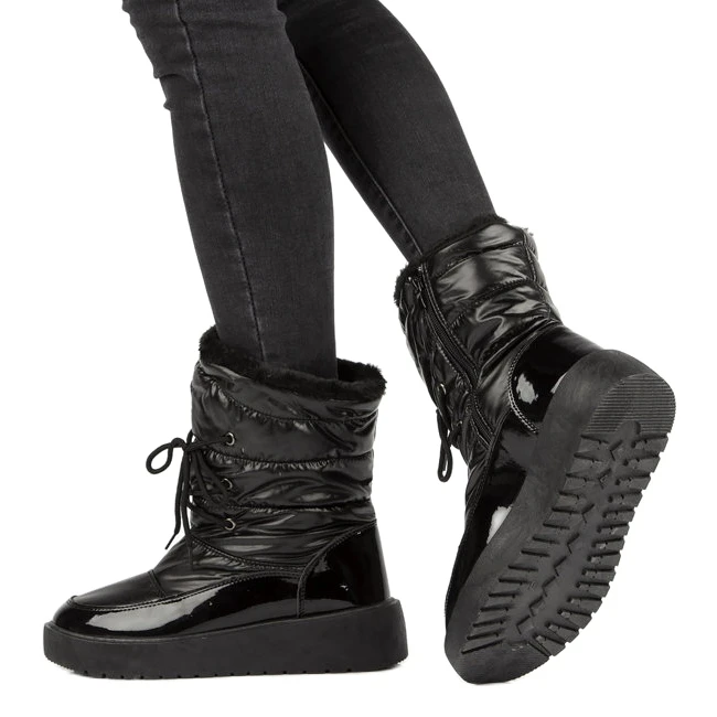 Les chaussures isolées avec fourrure sont précisément faites de cuir écologique laqué avec un matériau noir. Un talon plat de 4,5 cm et une tige sportive vous permettent de garder des solutions à la mode dans chaque centimètre. Les bottes d’hiver pour femmes sont le meilleur choix possible.