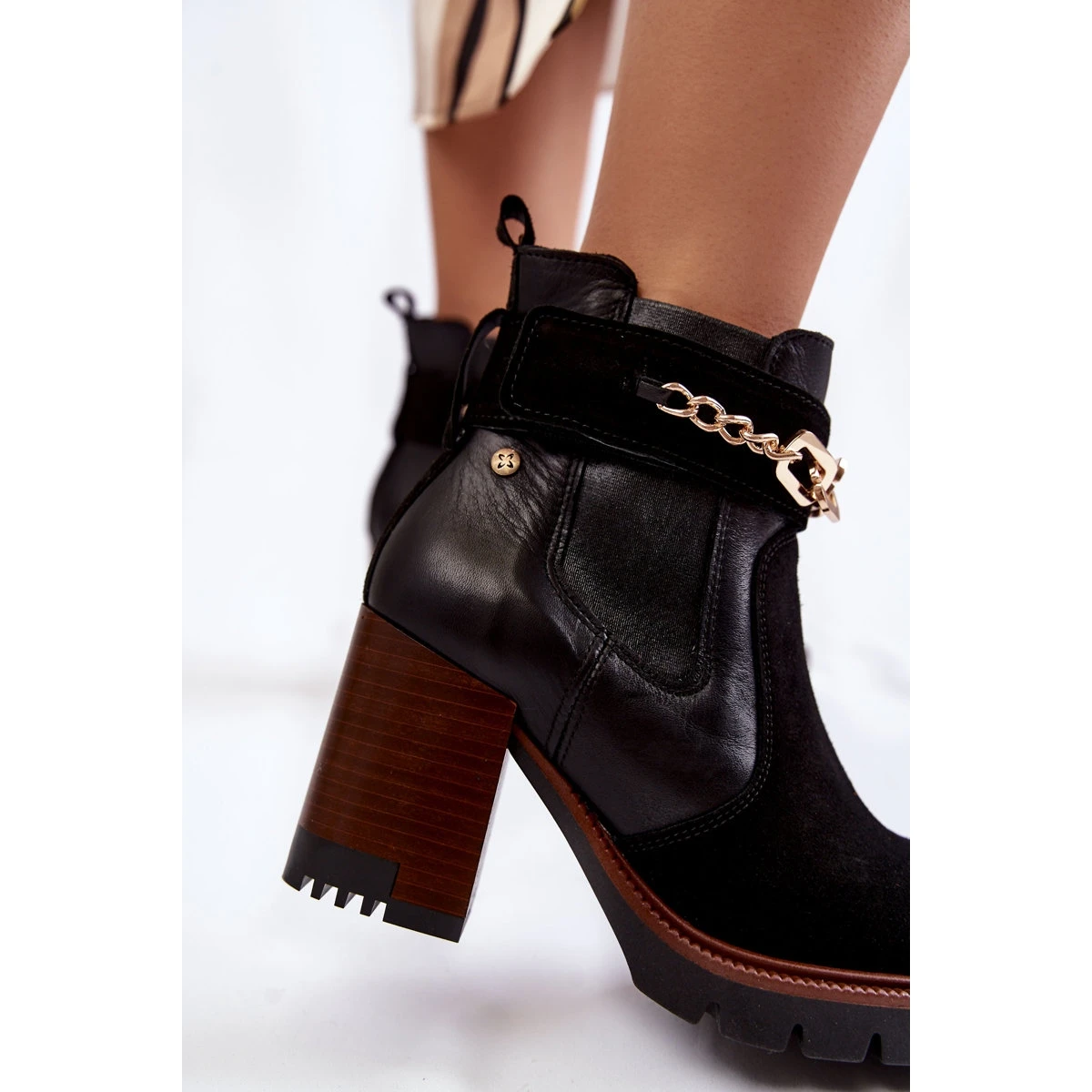Les bottes pour femmes Maciejka sont fabriquées en cuir de la plus haute qualité. Ils ont une sangle décorative avec une chaîne attachée avec du velcro. Les bottes ont des abrasions à la mode. Ils sont montés sur un talon en forme de poteau et une plate-forme avec une bande de roulement. L’intérieur était isolé avec une couverture de chaussures. La semelle intérieure souple assurera le confort lors de l’utilisation. Lorsque vous choisissez une taille, veuillez utiliser le tableau des tailles.