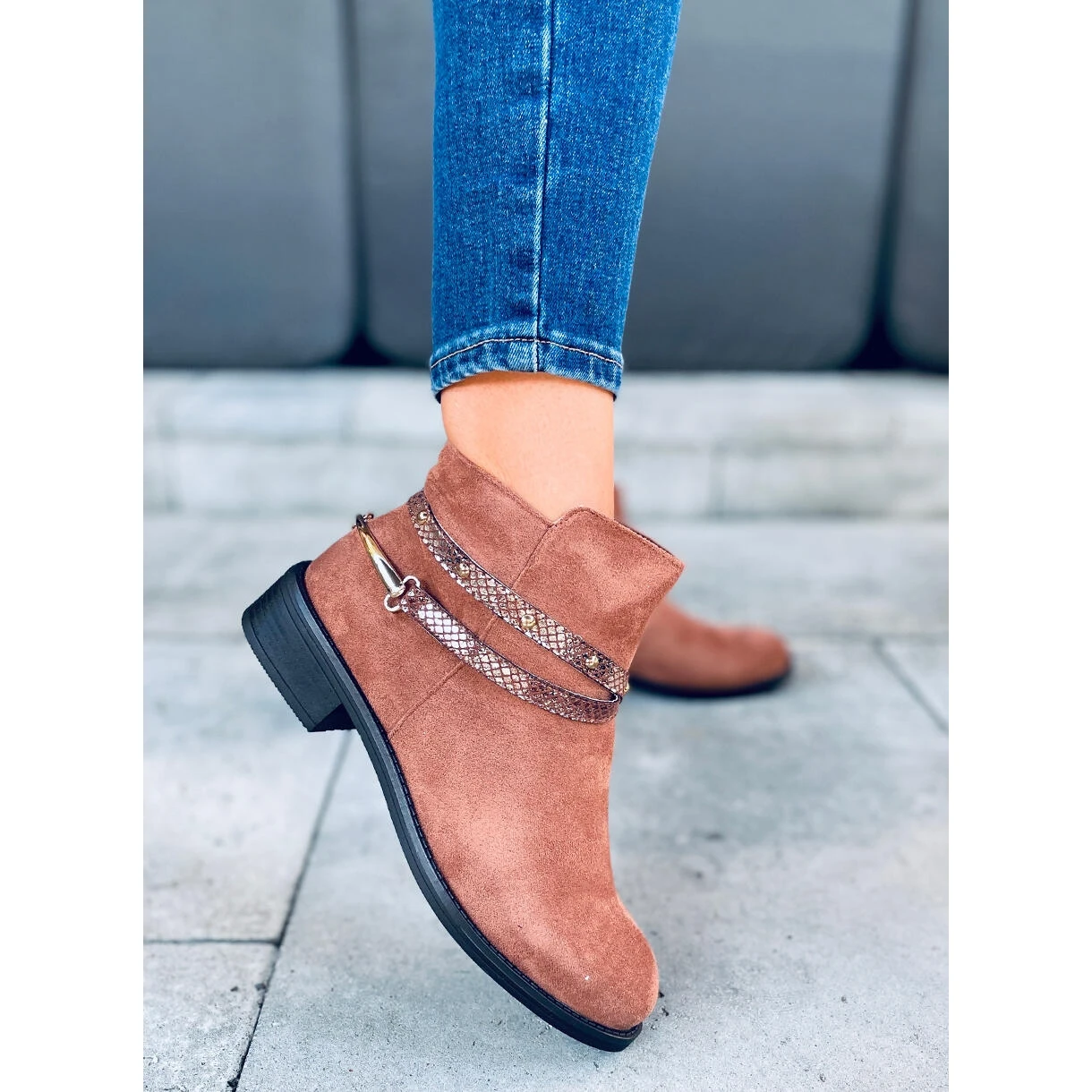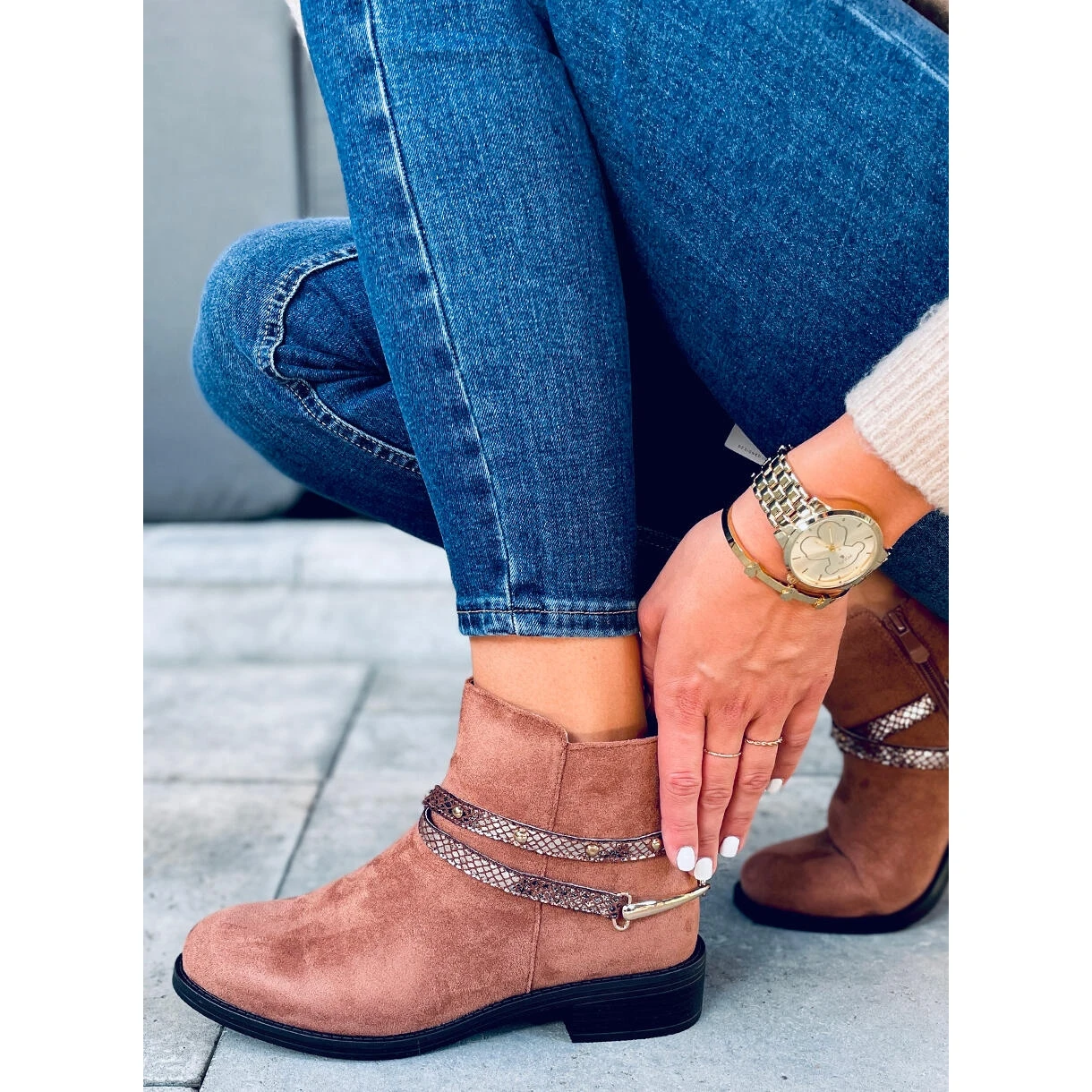 Bottines femme en daim à talons plats. L’empeigne avec des bandes de cheville enveloppantes avec un motif de peau de serpent leur donne un caractère à la mode… Ils ont des bouts ronds confortables et une fermeture à glissière pratique qui le rend facile à enfiler. Ce sont des chaussures parfaites pour un usage quotidien et vous les aimerez sûrement 🙂 Elles sont en daim écologique, et l’intérieur est doublé de fourrure délicate.