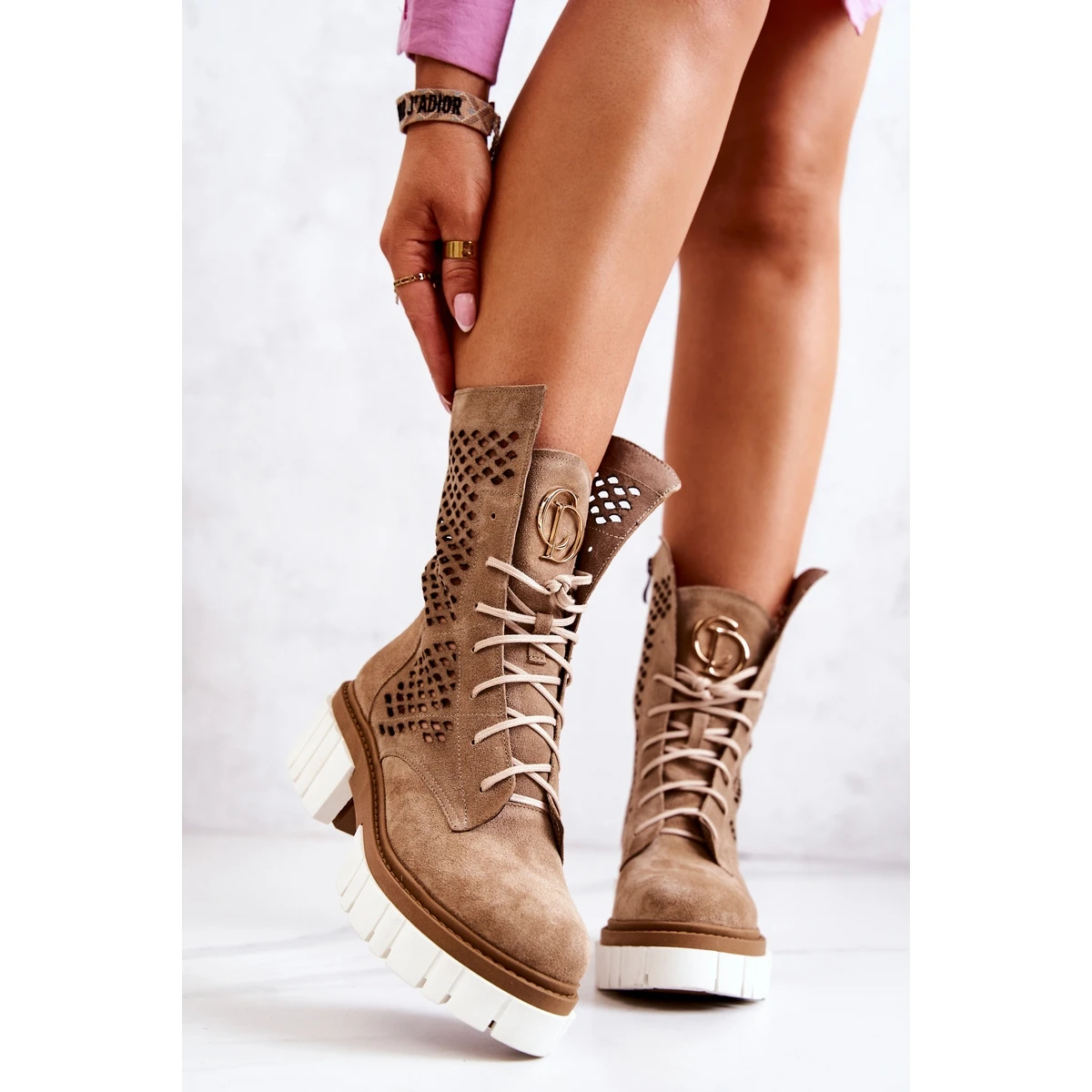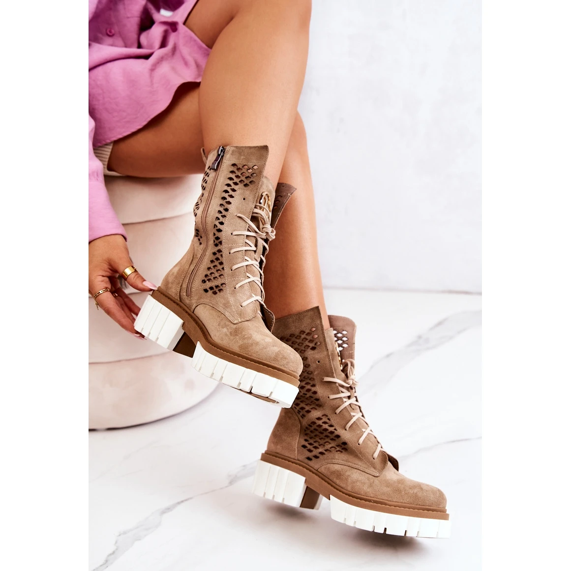 Les bottes de Nicole sont entièrement fabriquées en cuir naturel. Ils ont une plate-forme massive qui isole parfaitement du sol froid. Le motif ajouré lui donne fière allure avec de nombreux styles. Les travailleurs ont une fermeture à glissière pour un enfilage et un nouage faciles. La semelle intérieure douce prendra soin de votre confort. Il y a un emblème décoratif sur la langue. Lorsque vous choisissez une taille, veuillez utiliser le tableau des tailles.