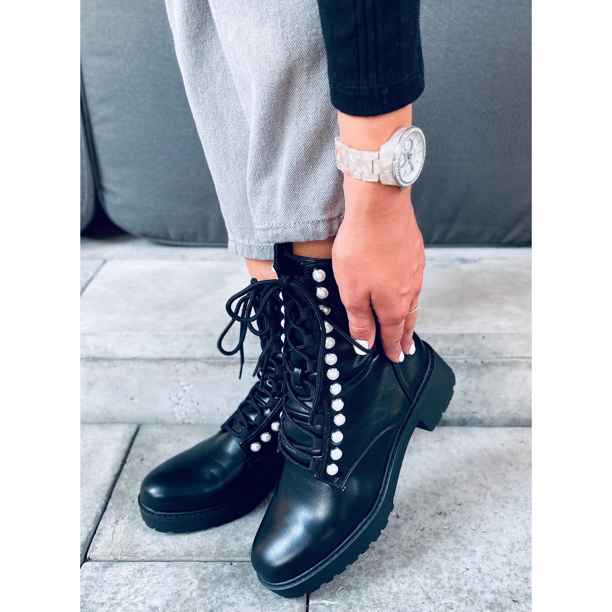 Bottes pour femmes à lacets – travailleurs. Un modèle avec des perles accrocheuses dans une couleur noire assortie est un must absolu 🙂 Vous allez devenir fou avec eux ! Un talon large veillera à votre confort, et l’enfilage sera facilité par une fermeture zippée pratique. Ils sont faits de cuir écologique très délicat avec une doublure en mousse.