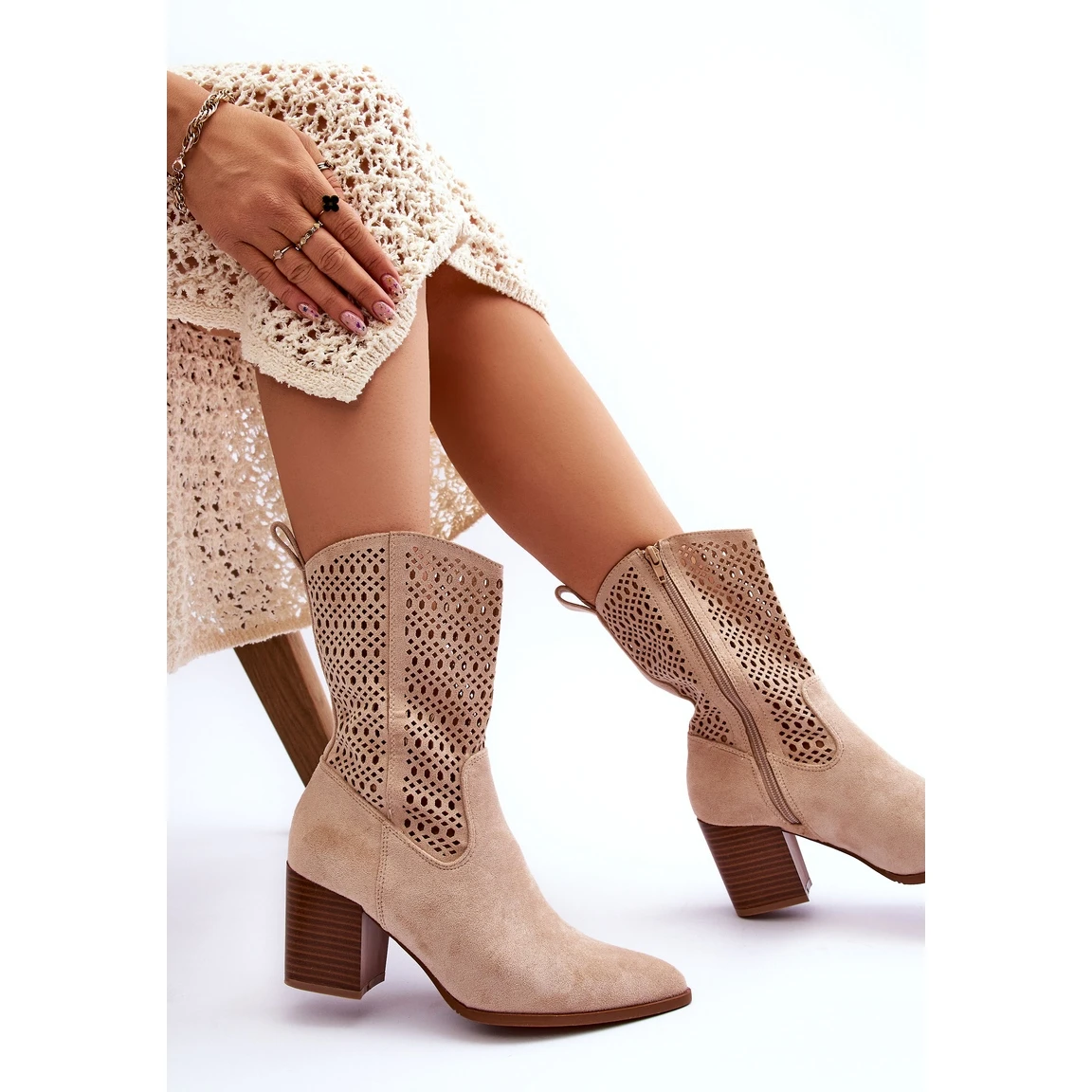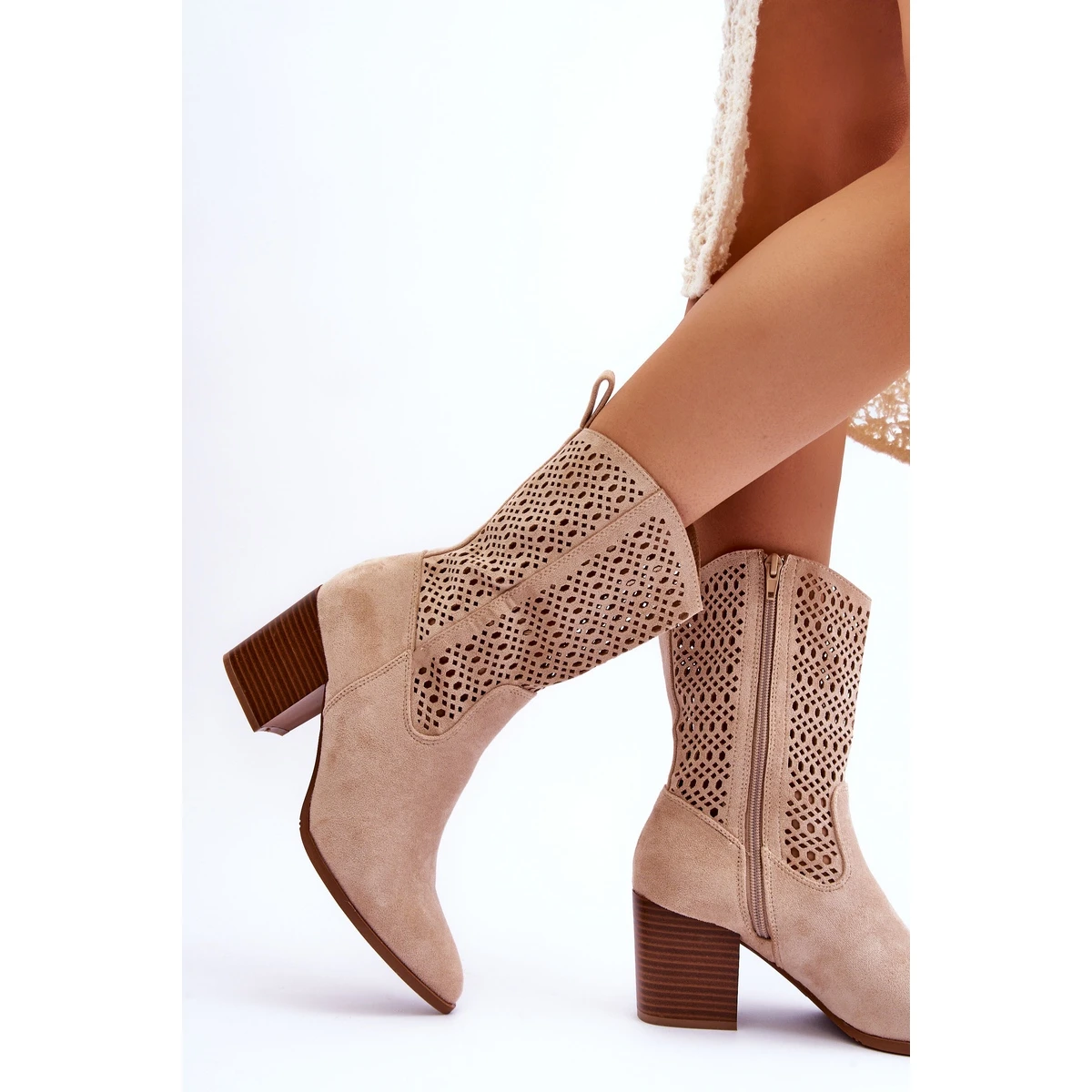Bottes de cow-boy à la mode avec une tige plus haute. Ils sont fabriqués en daim écologique avec un motif ajouré à la mode. L’insert de matière et le contrefort de talon rigidifié assureront votre confort. Ils ont un talon massif en forme de poteau. Parfait pour les robes et les jeans. Lorsque vous choisissez une taille, veuillez utiliser le tableau des tailles.