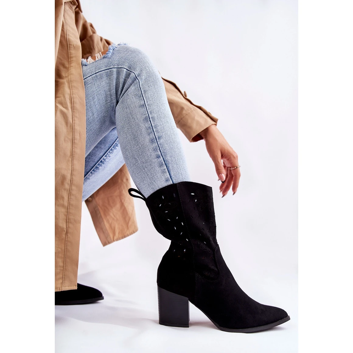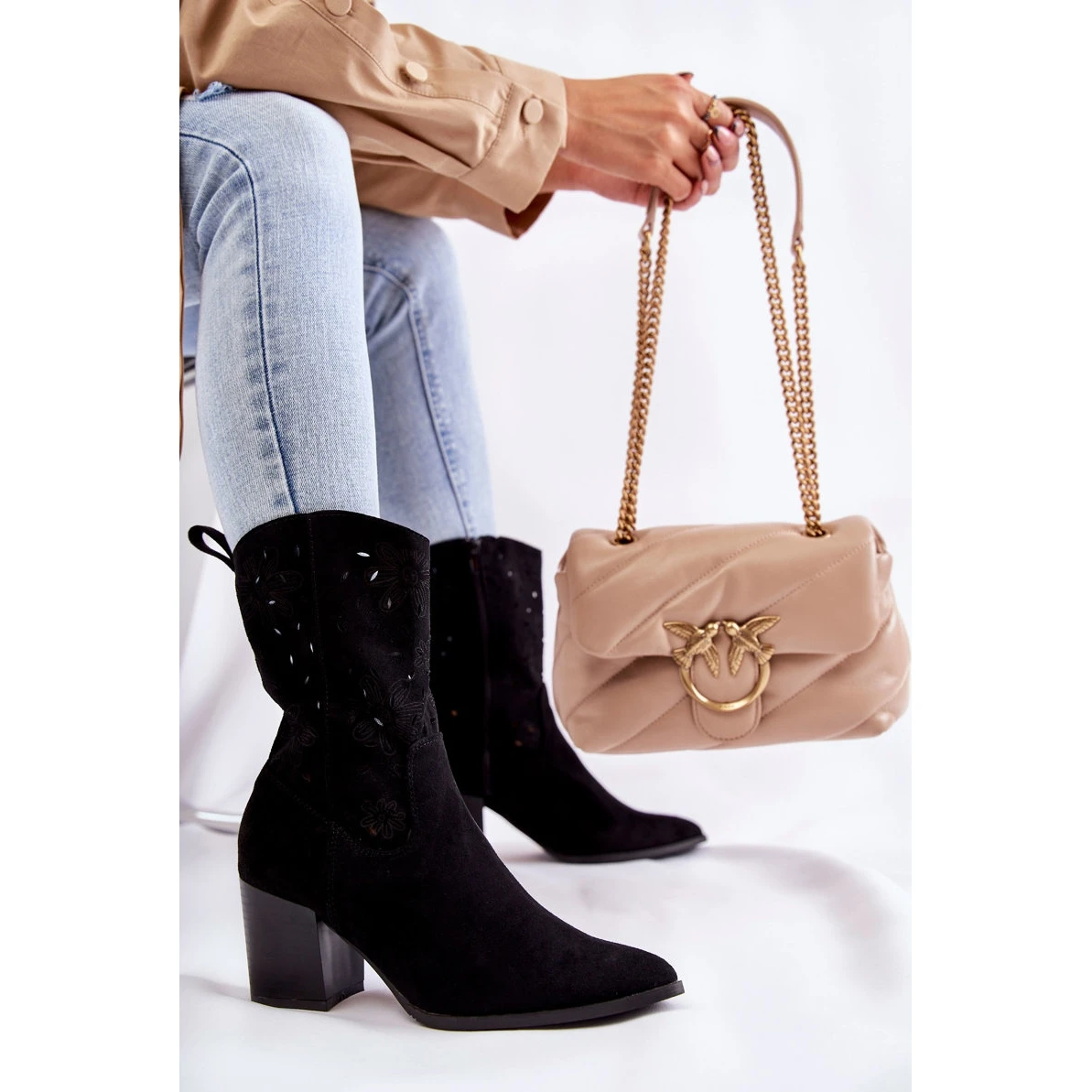 Santiags à talon en forme de tige massive. Le haut de la cheville dans un délicat motif ajouré avec un motif floral. Modèle classique à fermeture éclair avec un bout pointu caractéristique. Fabriqué en daim écologique. Non isolés, ils seront parfaits pour les saisons de transition. Ils s’adaptent à de nombreux styles, par exemple des pantalons ou des jupes de style bohème. Lorsque vous choisissez une taille, veuillez utiliser le tableau des tailles.