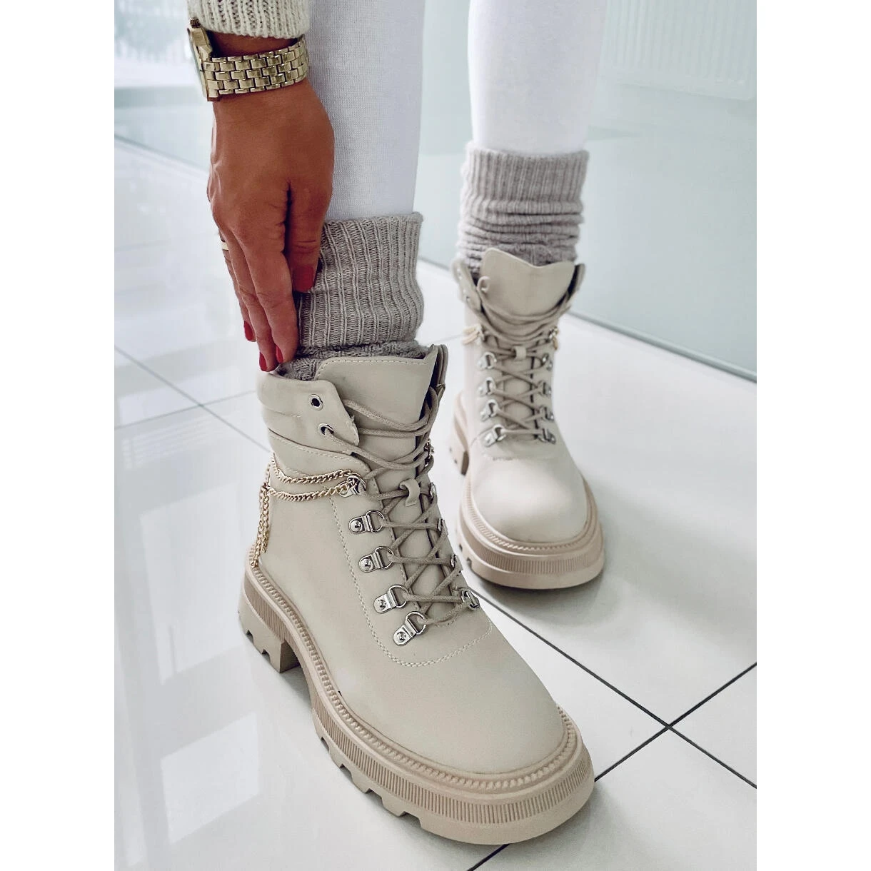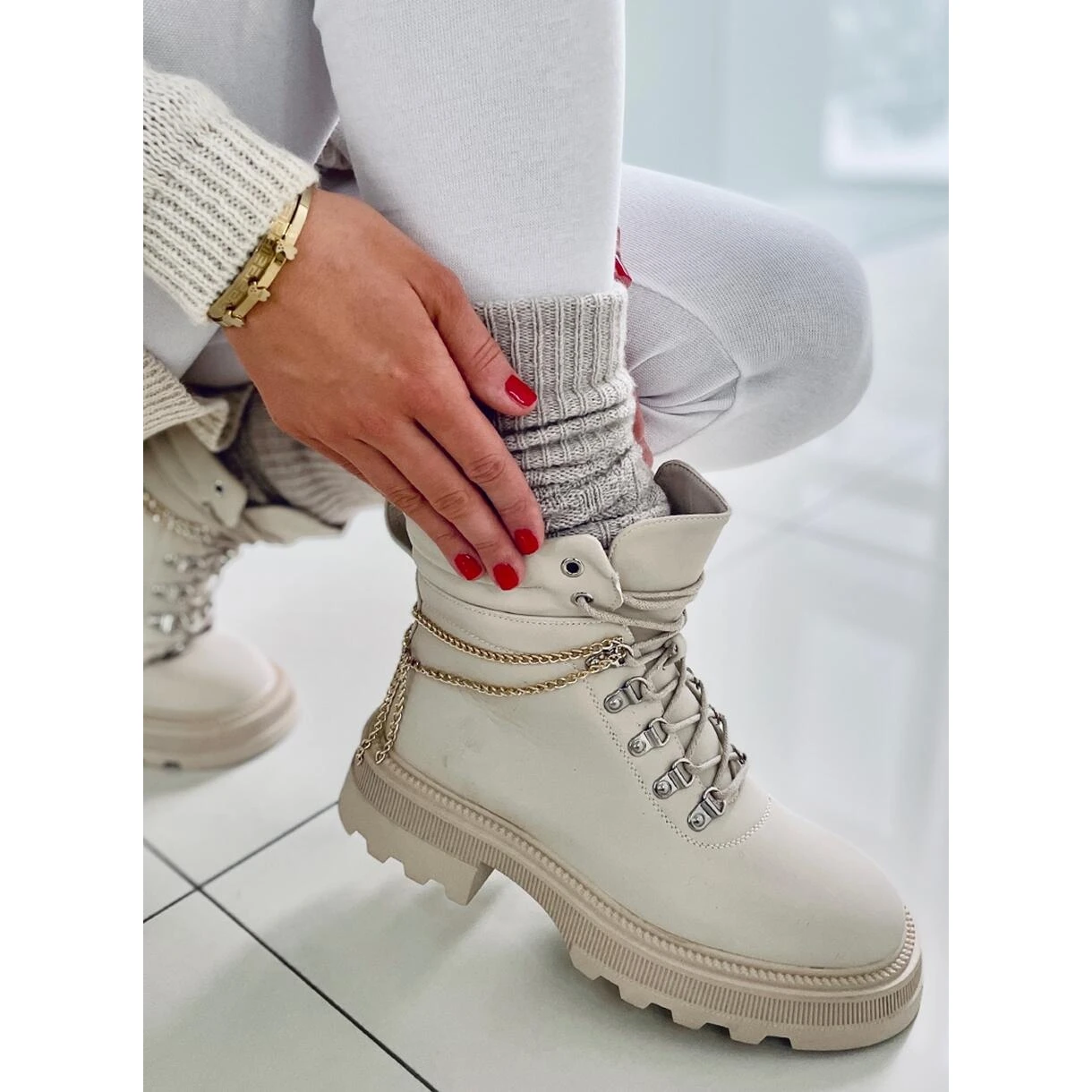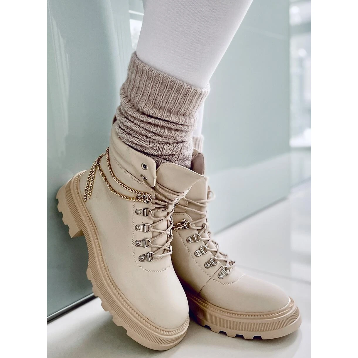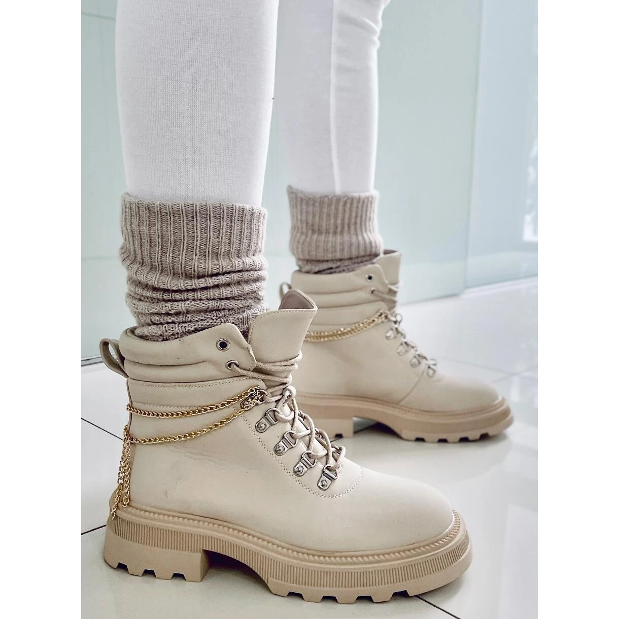 Bottes à lacets pour femmes – trappeurs sur une semelle épaisse. Si vous cherchez des chaussures confortables que vous ne voudrez plus quitter vos pieds, c’est ce que vous avez trouvé ! 🙂 La tige est diversifiée par l’accent le plus en vogue de cette saison – une chaîne qui souligne leur caractère unique. Ils sont faits de cuir écologique et l’intérieur est doublé de fourrure délicate.